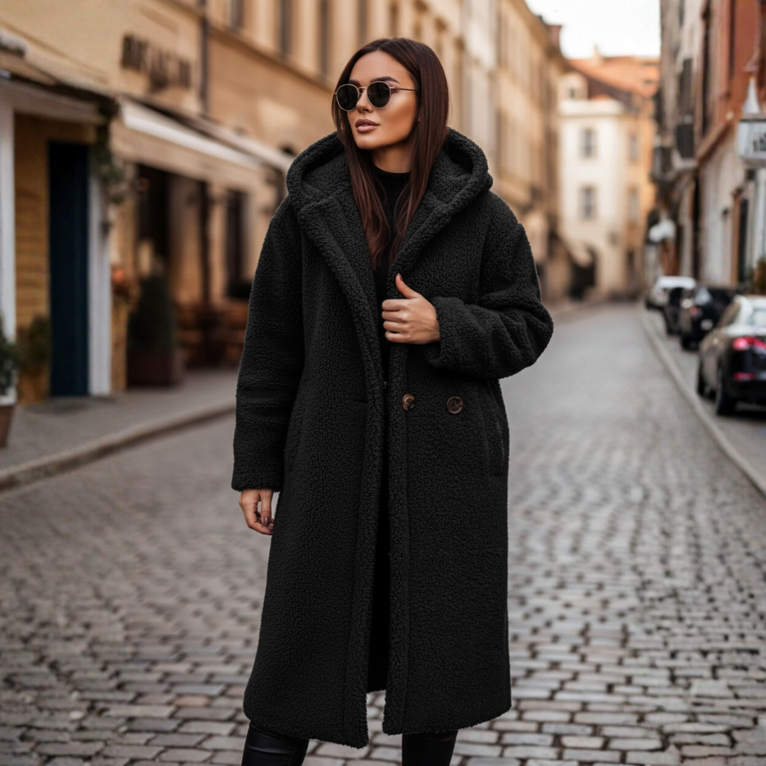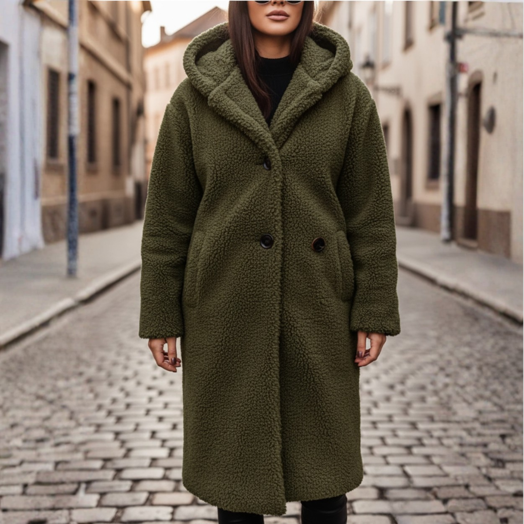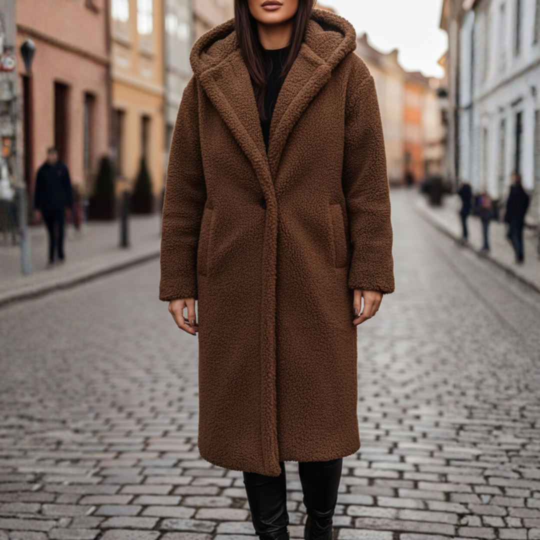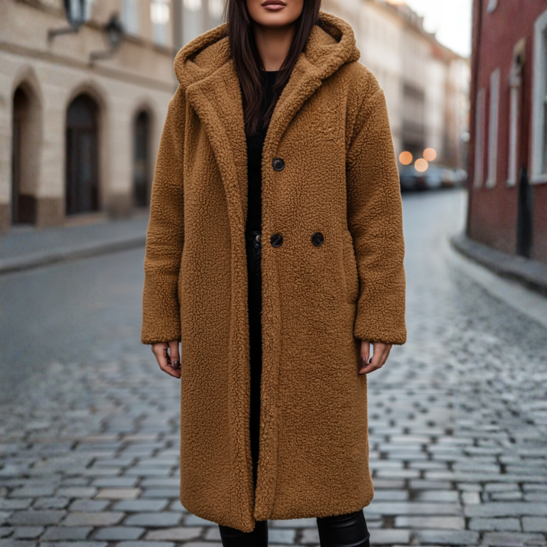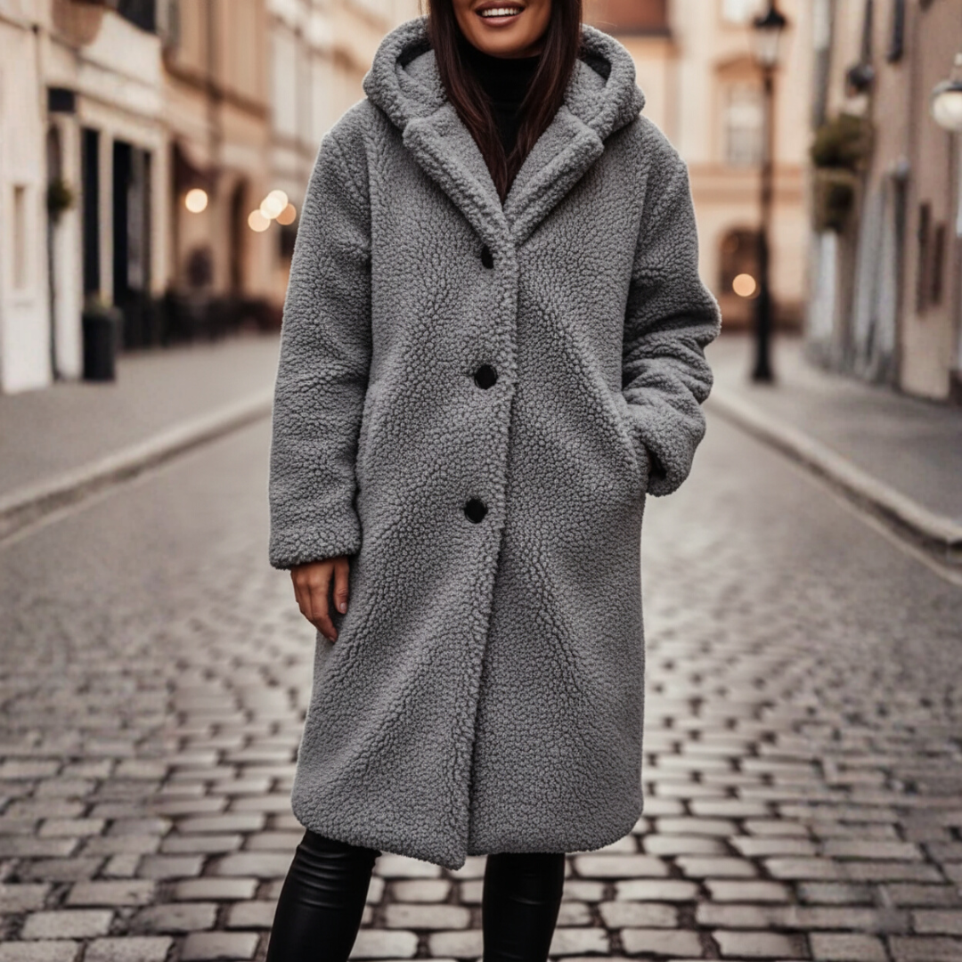Giacca in pelliccia sintetica da donna, perfetta per le giornate fredde. Il design elegante e la vestibilità comoda rendono questa giacca ideale per il clima autunnale e invernale. È dotata di cappuccio e bottoni frontali.