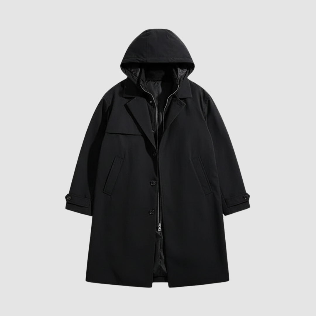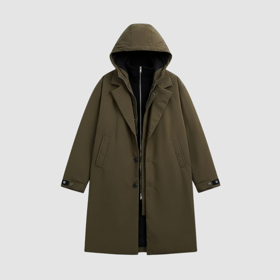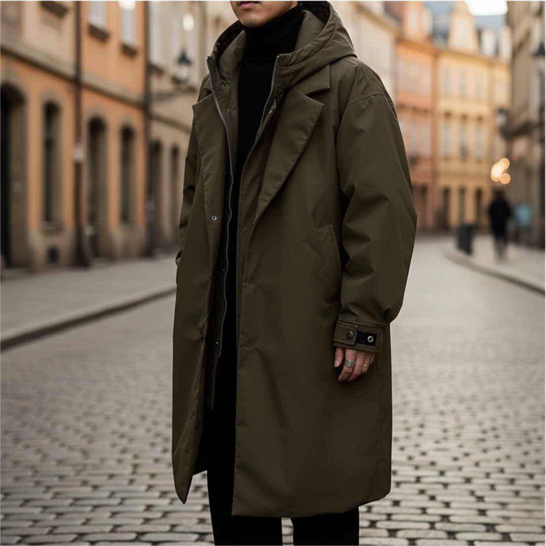Questa giacca da uomo con cappuccio offre una protezione ideale contro il freddo, mantenendo un design elegante e pratico. Il cappuccio regolabile e i bottoni frontali aggiungono funzionalità al suo stile.