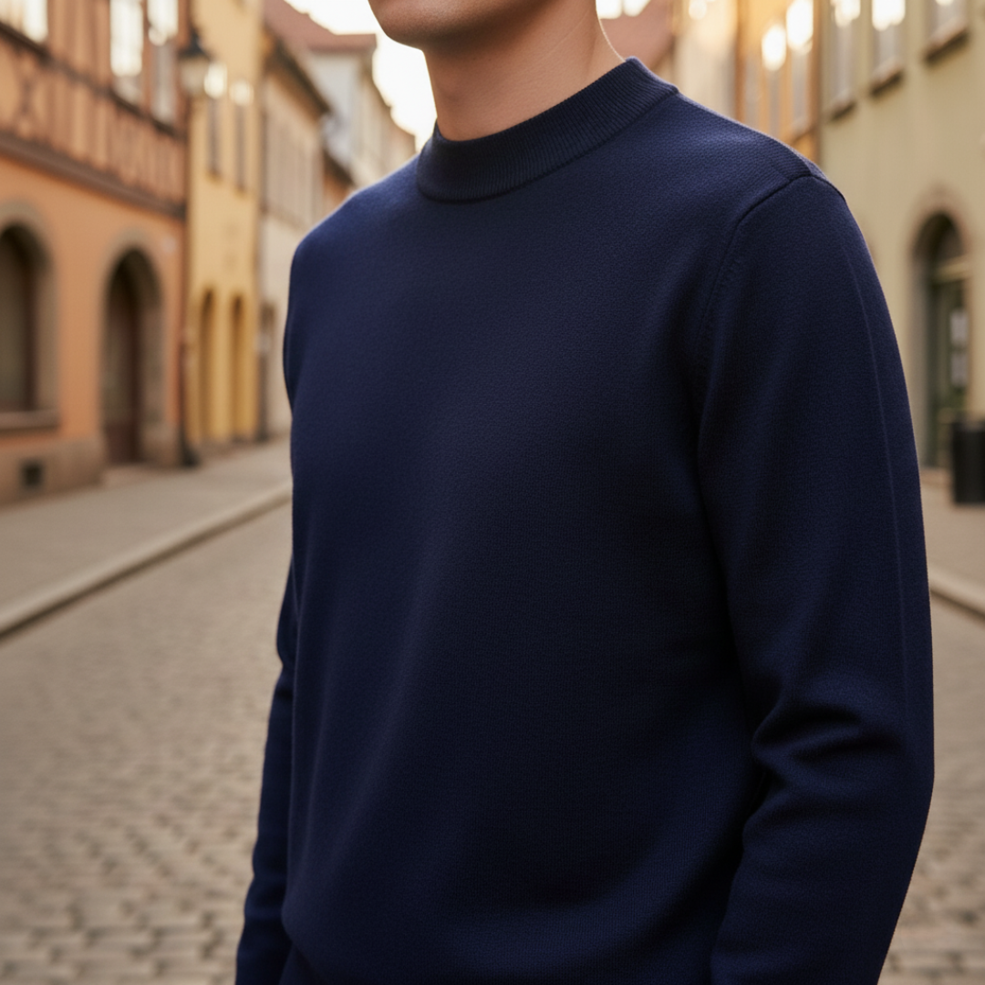 Questo è un maglione a tinta unita con maniche lunghe, destinato al pubblico maschile. La caratteristica principale del capo è il collo finto o "mock neck", che offre una copertura maggiore rispetto a un girocollo, senza la piega tipica del dolcevita. I bordi dei polsini e l'orlo inferiore sono rifiniti a coste.