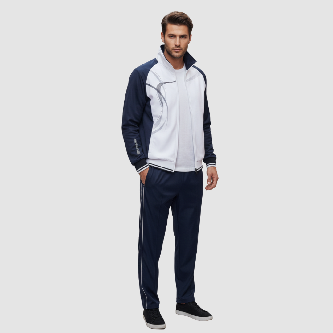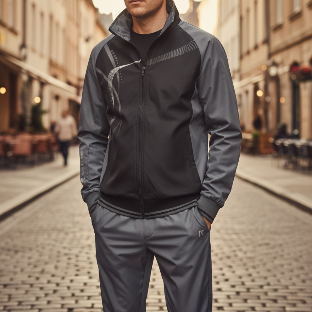 Cappotto da uomo di media lunghezza con chiusura frontale a bottoni e cerniera interna. Presenta un colletto a punta sovrapposto a un collo alto in maglia a costine che può essere completamente zippato. La giacca include tasche con patta oblique e dettagli con cinghia sulle spalle e sui polsini. Il capo è progettato per le basse temperature.